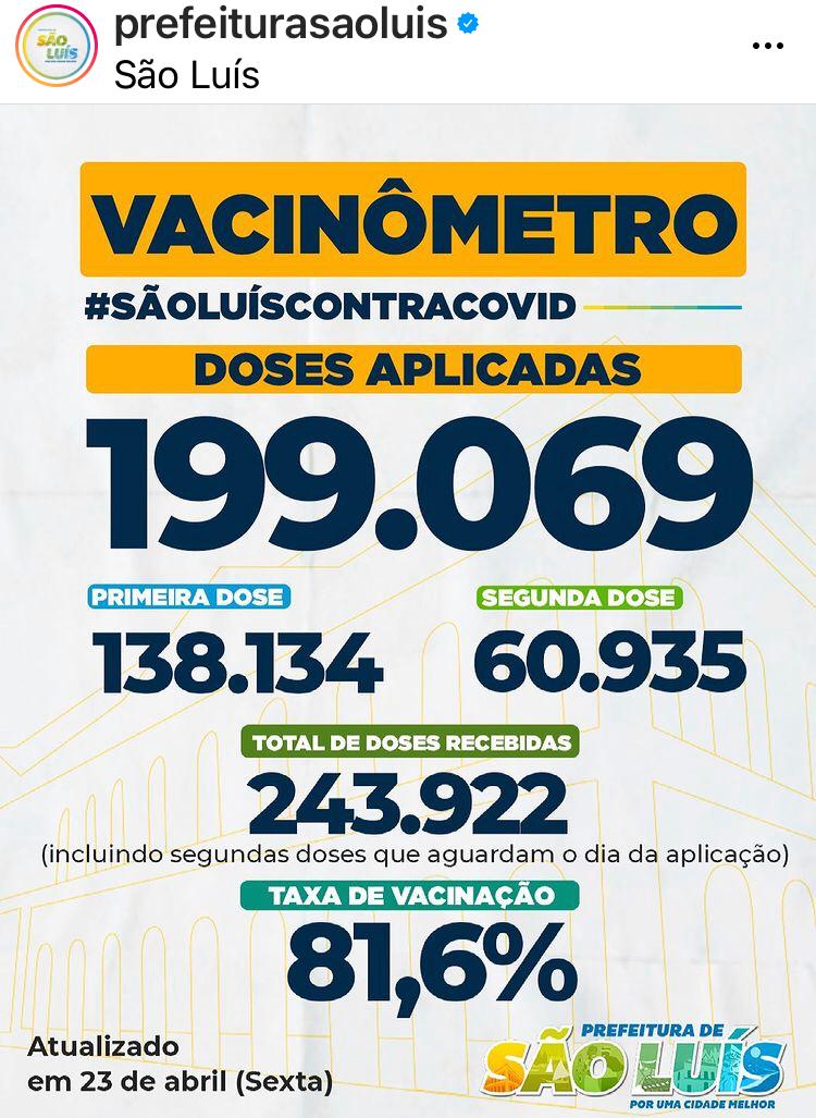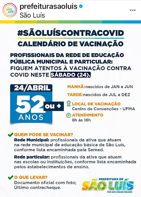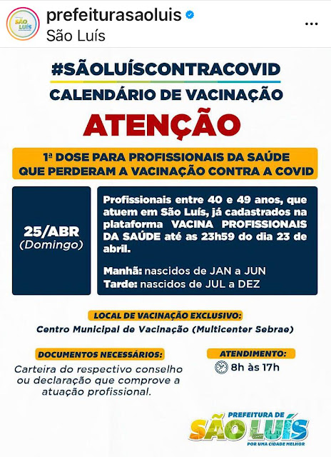 A vacinação será aberta para profissionais entre 40 e 49 anos, que atuam em São Luís, já cadastrados na plataforma Vacina Profissionais da Saúde, até as 23h59, do dia 23 de abril. Na parte da manhã, será a vez dos nascidos de janeiro a junho e a tarde, os nascidos de julho a dezembro.