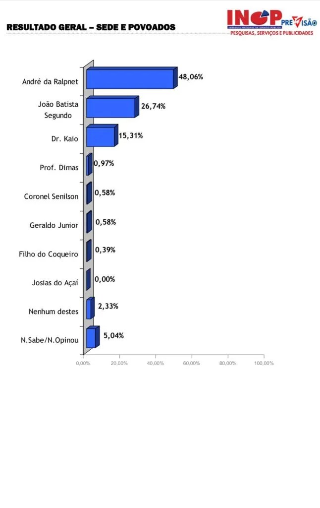 No cenário estimulado, quando os entrevistados têm acesso a nomes dos pré-candidatos, André da Ralpnet aparece em primeiro lugar com 48,06%. Em segundo lugar aparece João Batista Segundo, com 26,74%; Dr. Kaio, tem 15,31%; Professor Dimas, aparece com 0,97%; Coronel Senilson tem 0,58%; Geraldo Júnior 0,58%; Filho do Coqueiro, tem 0,39%; e Josias do Açaí não pontuou. 2,33% dos entrevistados disse não votar em nenhum dos nomes apresentados. Não souberam ou não quiseram responder são 5,04%.