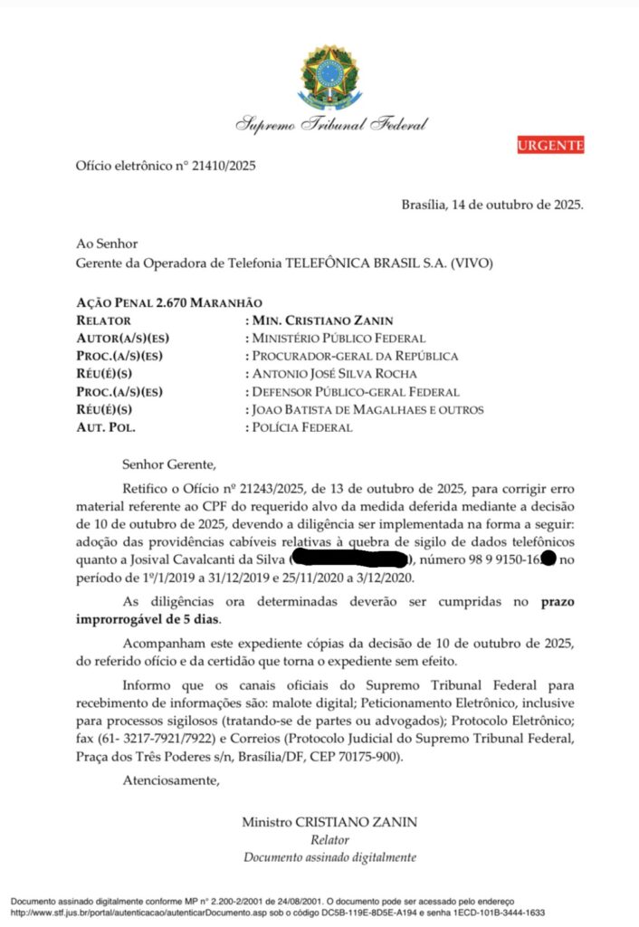 O despacho de Zanin determina que a operadora Vivo forneça, em até cinco dias, os registros telefônicos do número usado por Pacovan — (98) 9 9150‑16** — relativos aos períodos de 1º de janeiro a 31 de dezembro de 2019 e de 25 de novembro a 3 de dezembro de 2020. Mesmo após a morte do empresário, o acesso aos dados visa cruzar depoimentos, mapear ligações e movimentações e subsidiar a ação penal em curso no STF.